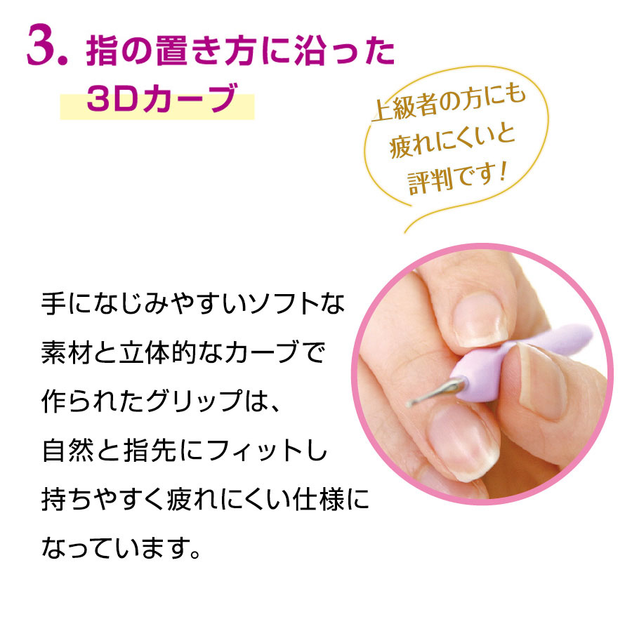 立体的なカーブで作られたグリップは、自然と指先にフィットします。しっかり握れるので余分な力をかけずに編むことができ、手が疲れにくい設計です。